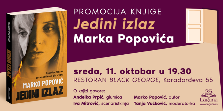 U sredu 11. oktobra od 19.30 u restoranu Black George, Karađorđeva 65, biće predstavljen roman Marka Popovića „Jedini izlaz“, po kome su snimljeni istoimeni film i serija.
