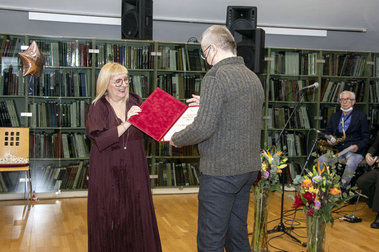 Nagradu je Dejanu Papiću, direktoru Lagune, uručila Jasmina Ninkov, direktorka Biblioteke grada Beograda.
