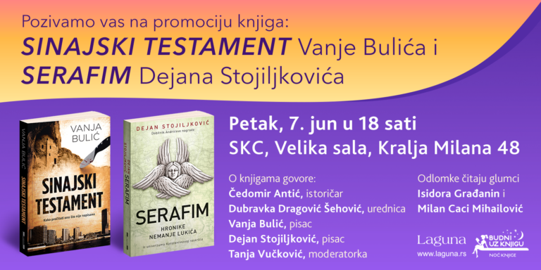 Prvog dana Noći knjige, u petak. 7. juna od 18 sati u Velikoj sali SKC-a svoje nove knjige „Sinajski testament“ i „Serafim“ predstaviće Vanja Bulić i Dejan Stojiljković. Pored njih, na promociji će govoriti i Čedomir Antić, istoričar, Dubravka Dragović Šehović, urednica, dok će odlomke iz knjiga čitati glumci Isidora Građanin i Milan Caci Mihailović.