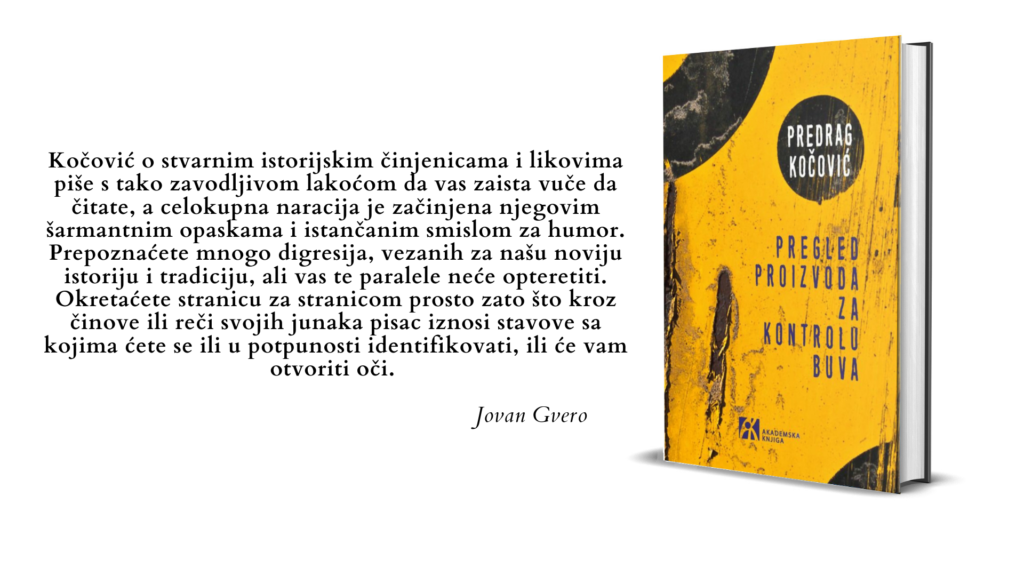 Nova knjiga priča Pregled proizvoda za kontrolu buva Predraga Kočovića dolazi nam nakon duže pauze i prethodnih knjiga, romana Spot (2008) i Žmurke (2005), koje su nam predstavile novog ali temeljnog i zrelog pripovedača, izuzetno senzibilisanog rukopisa. Kao i u pomenutim izdanjima, Kočović je i u ovoj knjizi zadržao disciplinovan jezik i rečenicu, ali s veoma profilisanom gradacijom naracije. Njegov pripovedački postupak je dramaturški znatno drugačije koncipiran i, kao vizuelni umetnik (autor je slikar po obrazovanju), može se primetiti da je otvorio novi koncept kao ciklus ili niz transparentnih vizuelnih planova ukoričenih u pripovedački mozaik. Iako je, uveren sam, posve nebitno i izlišno svrstavati knjige u žanrove, ne mogu da ne primetim da ovu knjigu nije lako klasifikovati. Pored navedenog, razlog tome je i osobenost pripovedačkog umeća i talenata koje poseduje Predrag Kočović. On o stvarnim istorijskim činjenicama i likovima piše s tako zavodljivom lakoćom da vas zaista vuče da čitate, a celokupna naracija je začinjena njegovim šarmantnim opaskama i istančanim smislom za humor. Prepoznaćete mnogo digresija, vezanih za našu noviju istoriju i tradiciju, ali vas te paralele neće opteretiti. Okretaćete stranicu za stranicom prosto zato što kroz činove ili reči svojih junaka pisac iznosi stavove sa kojima ćete se ili u potpunosti identifikovati, ili će vam otvoriti oči. Nešto poput Serđa Leonea; na pitanje zašto integralna verzija Bilo jednom u Americi traje 229 minuta, Leone je odgovorio: „Ja sam u zrelim godinama, da imam šta da gledam”. Tako i Kočović ima knjigu u kojoj će ozbiljan svet i te kako imati šta da vidi rado je čitajući.