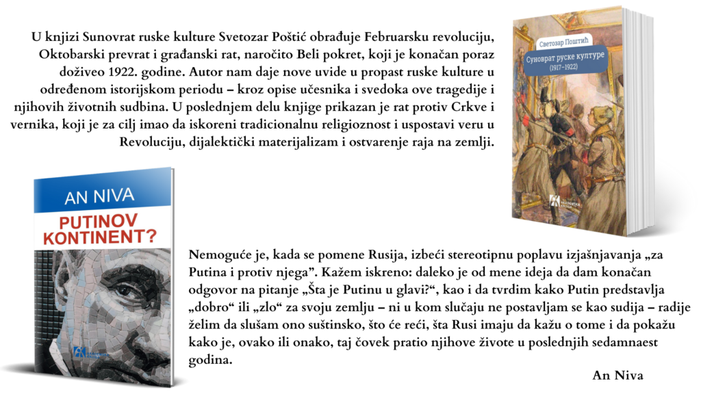 Izdavačka kuća Akademska knjiga nedavno je objavila nove naslove. U pitanju su Sunovrat ruske kulture Svetozara Poštića, Putinov kontinent? An Niva i Pregled proizvoda za kontrilu buva Predraga Kočovića.