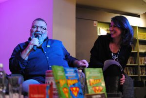 Urednica Misirlić nije prestajala da se smeška ili čak od srca smeje, a sa njom i publika dok su se spisateljica i njen ilustrator nadmetali ko će se dosetiti smešnije replike.