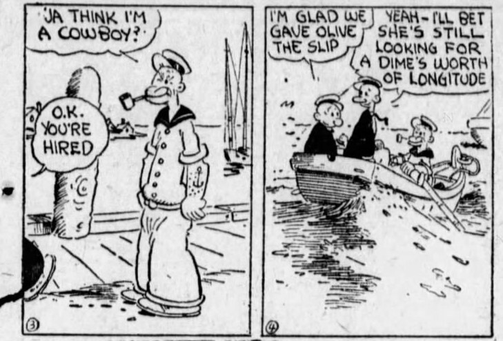 “Misliš li da sam kauboj?”, sarkastično mu je odgovorio snagator sa lulom i mornarskom kapicom, što je to trebalo da mu bude i poslednja replika. Međutim, zadržao se kao stalni junak, koji će kroz decenije dobiti još mnogo prijatelja i neprijatelja, kao i čudesni izvor snage – konzervirani spanać.