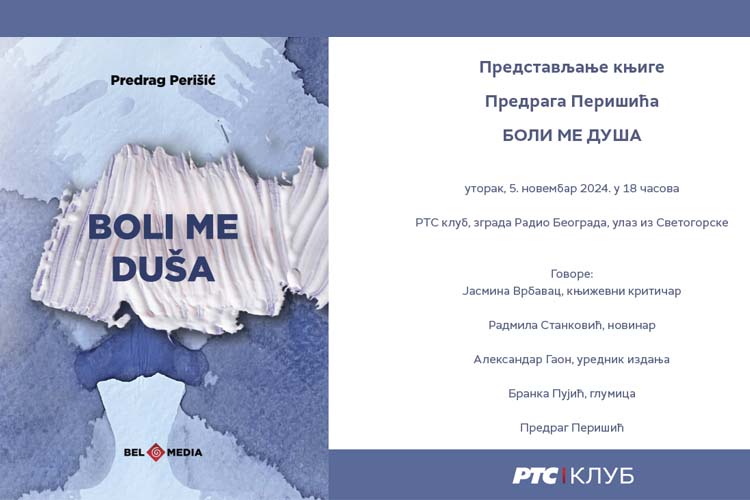 U utorak, 05. novembra 2024. godine u 18 časova, u RTS Klubu (zgrada Radio Beograda, ulaz iz Svetogorske) biće držana promocija knjige „Boli me duša“ Predraga Perišića.