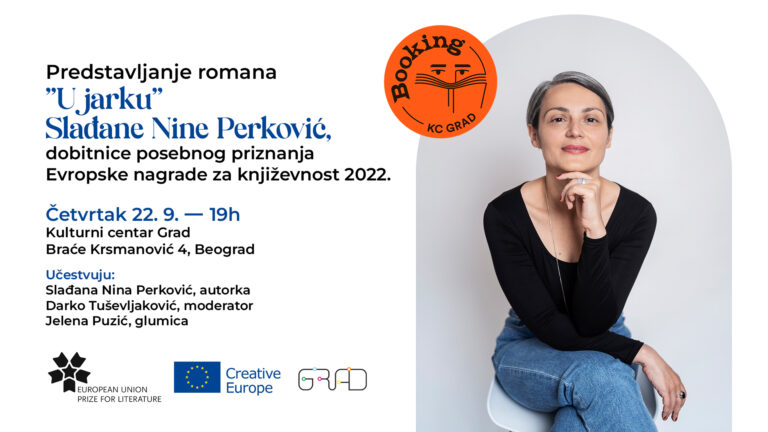 U četvrtak, 22. septembra u 19h u Kulturnom centru Grad (Braće Krsmanović 4, Beograd) biće predstavljen roman spisateljice Slađane Nine Perković “U jarku”, ovogodišnje dobitnice specijalnog priznanja Evropske nagrade za književnost.