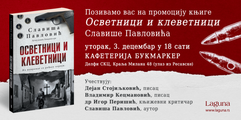 Zbirka priča Slaviše Pavlovića „Osvetnici i klevetnici“ biće predstavljena u utorak 3. decembra 2024. u 18 sati u kafeteriji Bukmarker knjižare Delfi SKC.