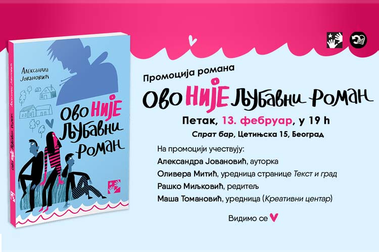 Roman Ovo nije ljubavni roman autorke Aleksandre Jovanović, sa ilustracijama Katje Klimove, biće predstavljen u petak, 13. februara, u 19 časova, u baru „Sprat“ (Cetinjska 15).
