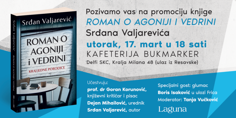Promocija knjige „Roman o agoniji i vedrini“ Srđana Valjarevića, kojom pisac završava čuvenu sagu o Fricu i Dobrili, biće održana u utorak 17. marta u 18 sati u kafeteriji „Bukmarker“ knjižare Delfi SKC.