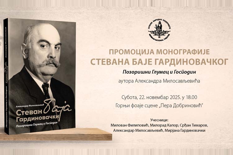 U subotu, 22. novembra, u Gornjem foajeu scene „Pera Dobrinović” sa početkom u 18 časova biće održana promocija monografije „Pozorišni glumac i gospodin”, posvećene Stevanu Baji Gardinovačkom, jednom od najznačajnijih dramskih umetnika Srpskog narodnog pozorišta. Autor knjige je pozorišni kritičar Aleksandar Milosavljević.