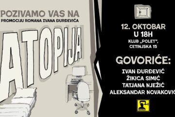 Promocija romana “Atopija” Ivana Đurđevića Novosti 09/10/2023Promocija romana “Atopija” (Presing, 2023) Ivana Đurđevića biće održana u četvrtak, 12. oktobra od 18 sati u klubu “Polet” (Cetinjska...