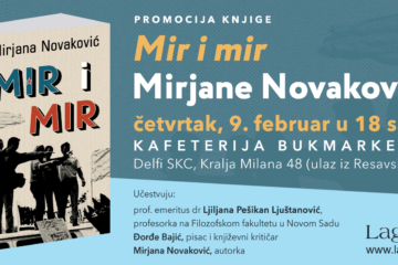 Promocija knjige „Mir i mir“ Mirjane Novaković Novosti 03/02/2023Novi roman poznate i nagrađivane spisateljice Mirjane Novaković „Mir i mir“ biće predstavljen beogradskoj publici u četvrtak 9. februara od...
