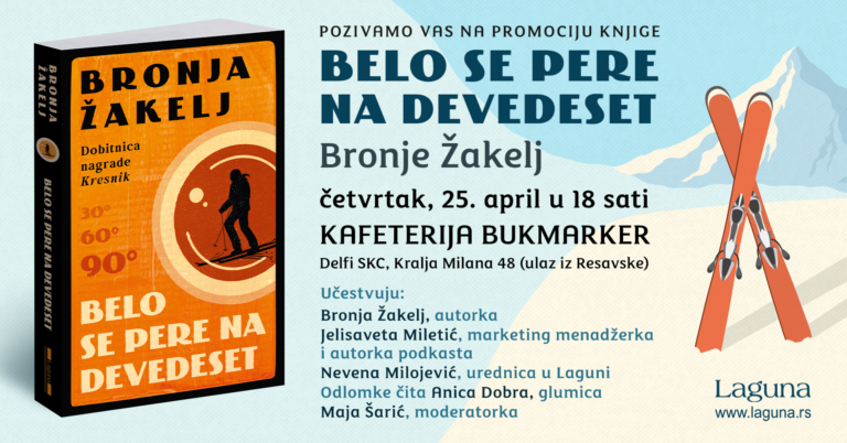 Slovenačka autorka Bronja Žakelj predstaviće pred beogradskim čitaocima roman „Belo se pere na devedeset“ u četvrtak 25. aprila od 18 sati u knjižari Delfi SKC. Pored autorke, o knjizi će govoriti i Jelisaveta Miletić, marketing menadžerka i autorka podkasta, kao i urednica u Laguni Nevena Milojević. Odlomke će čitati glumica Anica Dobra, koja će igrati jednu od glavnih uloga u filmu koji se snima po Bronjinom romanu.